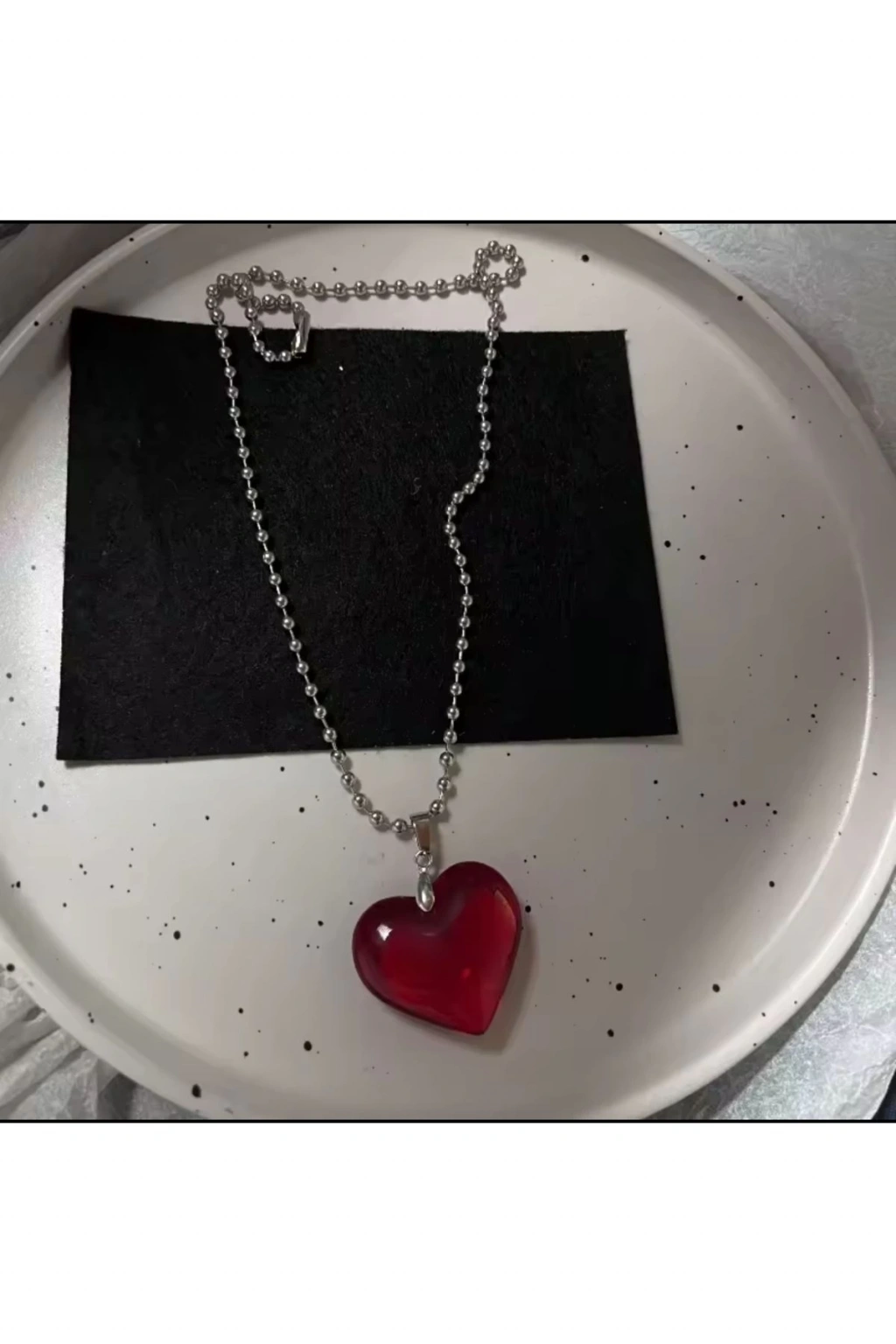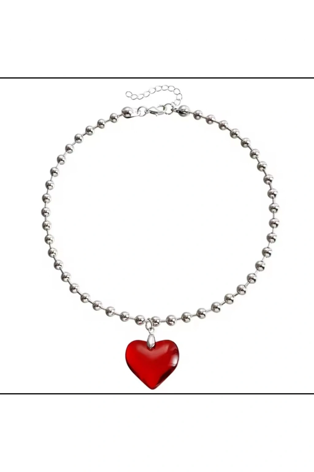 Vintage Kırmızı Kalp Süet İpli Choker Kolye (Kırmızı)