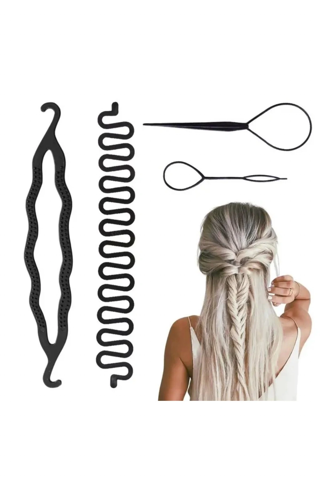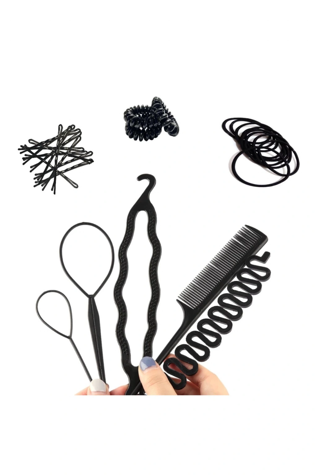 Saç topuz yapma ve saç örme aparatı seti. Saç aparatları ile Sicim modeli, lady modeli, iki yandan model, bantlı model, kraliçe modeli, şelale modeli, ters-Yüz modeli, yarım atkuyruğu, örgü ve benzer daha birçok saç modelini oluşturabilirsiniz. ; Kullanımı kolay ve pratiktir. ; Uygun büyüklükteki aparatı alın ve bağladığınız saçların ucunu, aparatın halkasından geçirin. Bağladığınız saçların tam ortasına aparatın sivri tarafı gelecek şekilde aşağıya doğru batırarak ters çevirin. Topuzunuz hazır. Plastik malzemeden imal edilmiştir. ; Paket içeriği: 20 adet tel toka, 3 adet makarna lastik toka, 10 adet kumaş lastik toka, 5 parça topuz yapma ve saç örme aparatı seti. ;